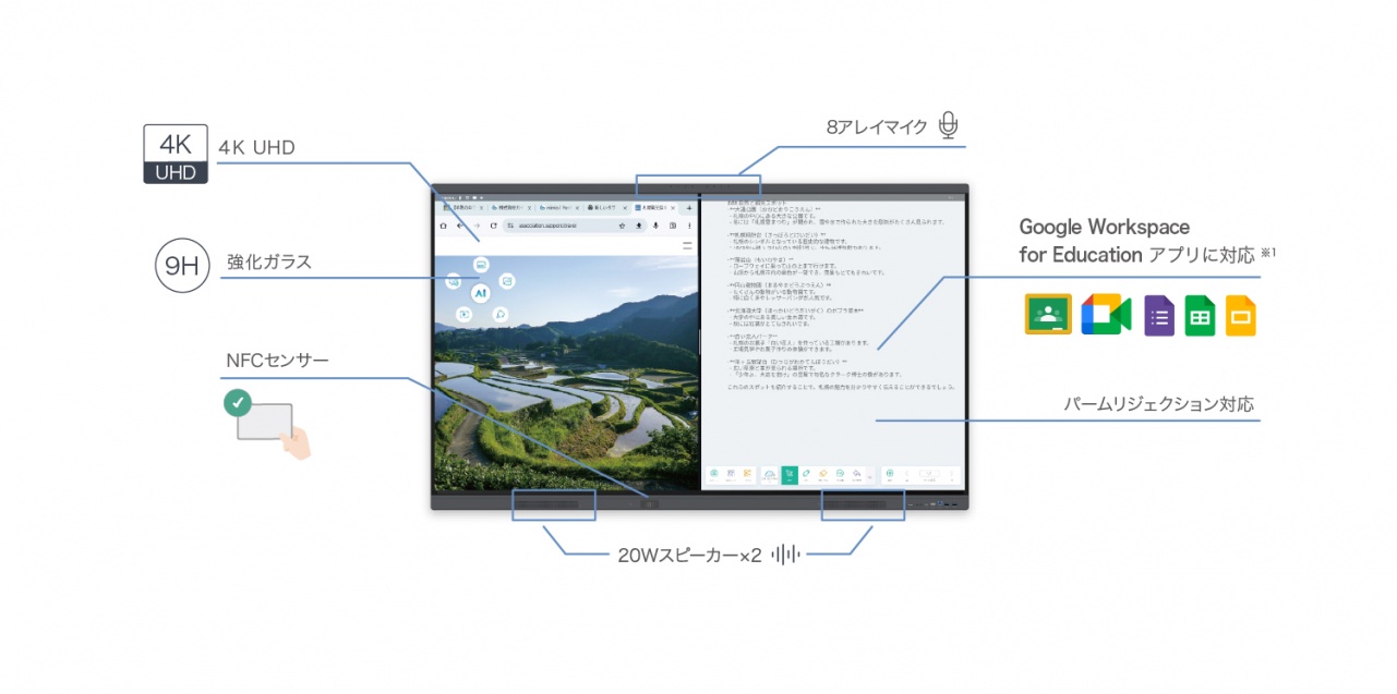 Google Meet やGoogle Classroom※1 などのアプリ搭載で、教育・学習に必要なツールを電子黒板上ですぐに活用できます。さらに、8 アレイマイクで教室の声をクリアにキャッチ。話しかけるだけで音声検索もでき、新しい学びが広がります。mimio DMS での管理やChromeOS Flex ※2 の拡張も可能です。